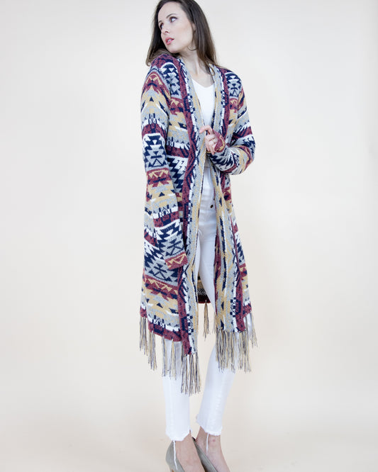 Aztec Bohemian Stripe Cardigan with Fringe