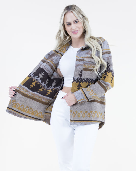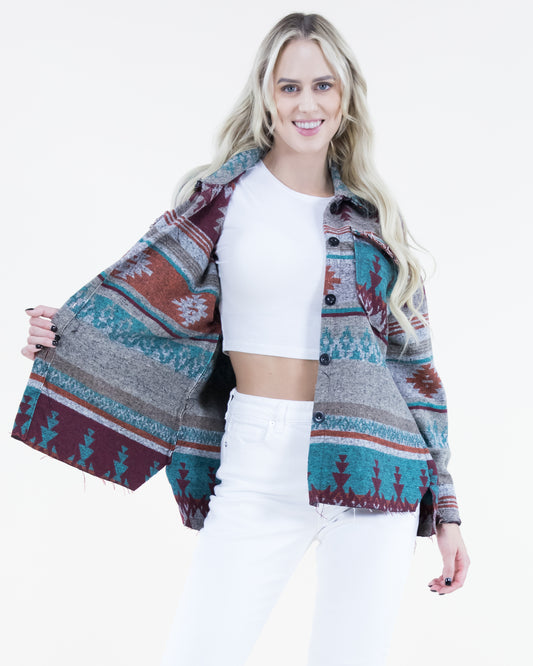 Aztec Print Shacket w/ Front Pockets & Buttons