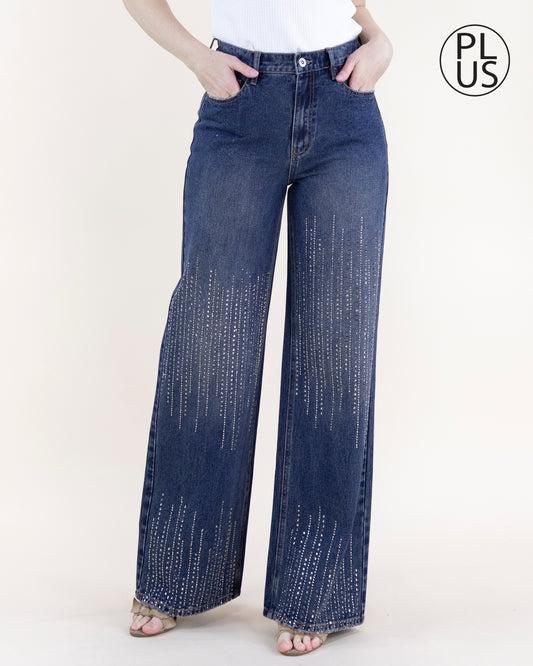 Square Rhinestone Lines Embellished High Rise Ultra Wide Leg Jeans - DENIM