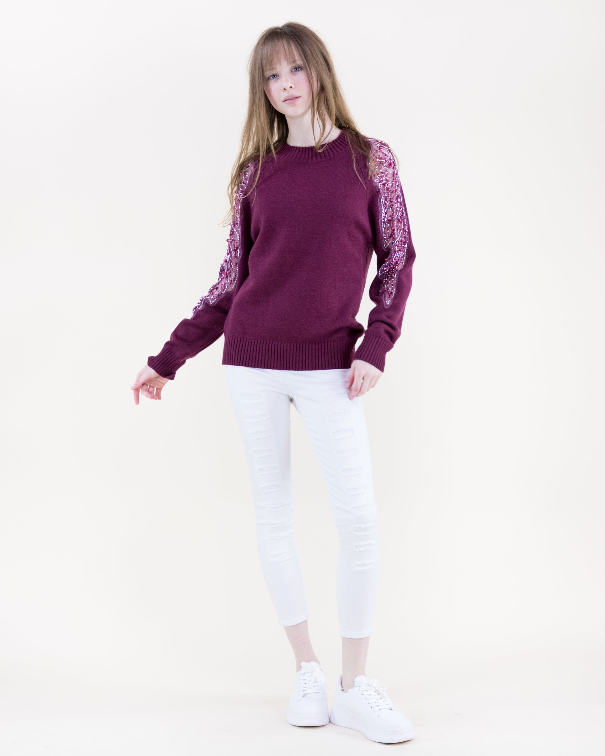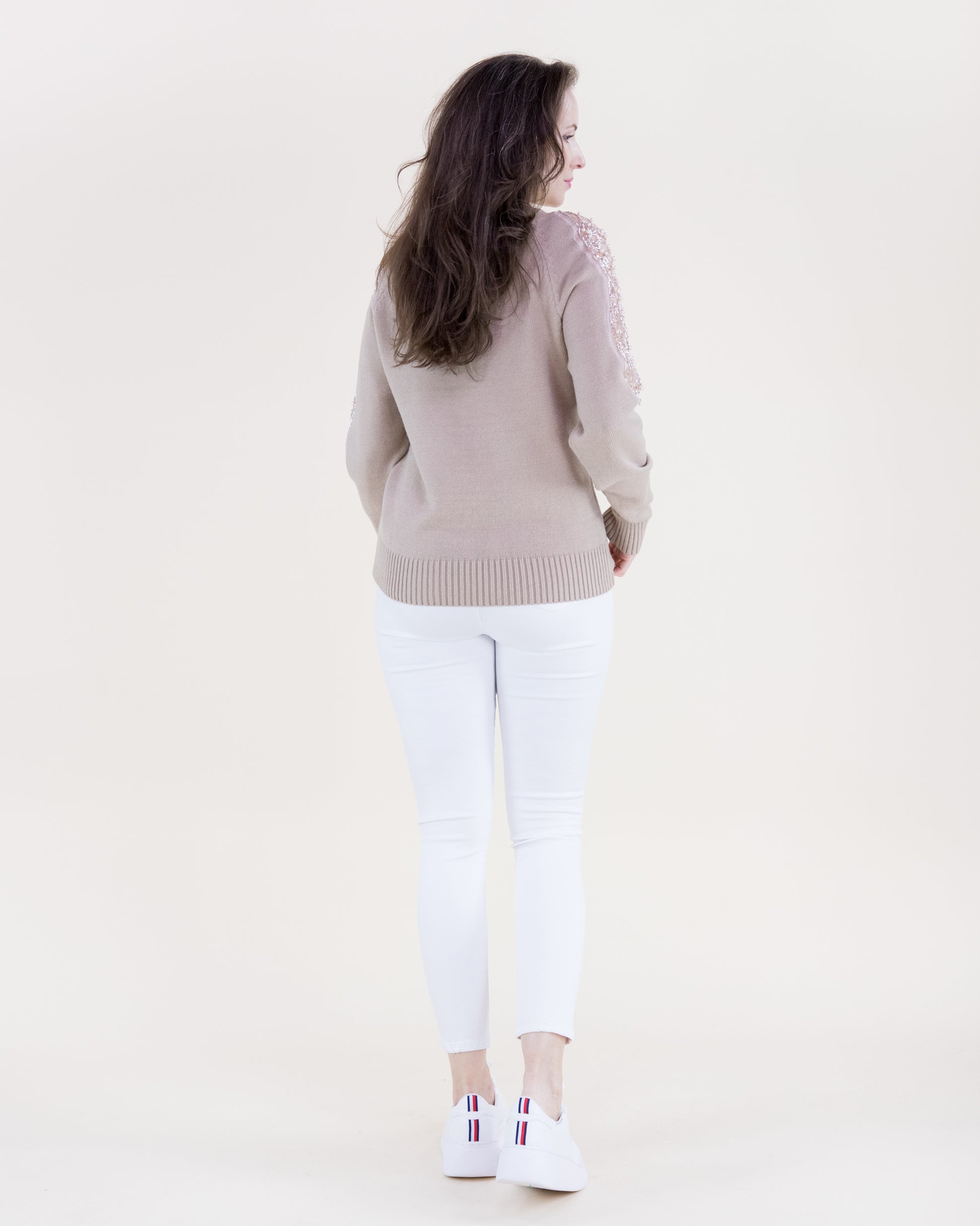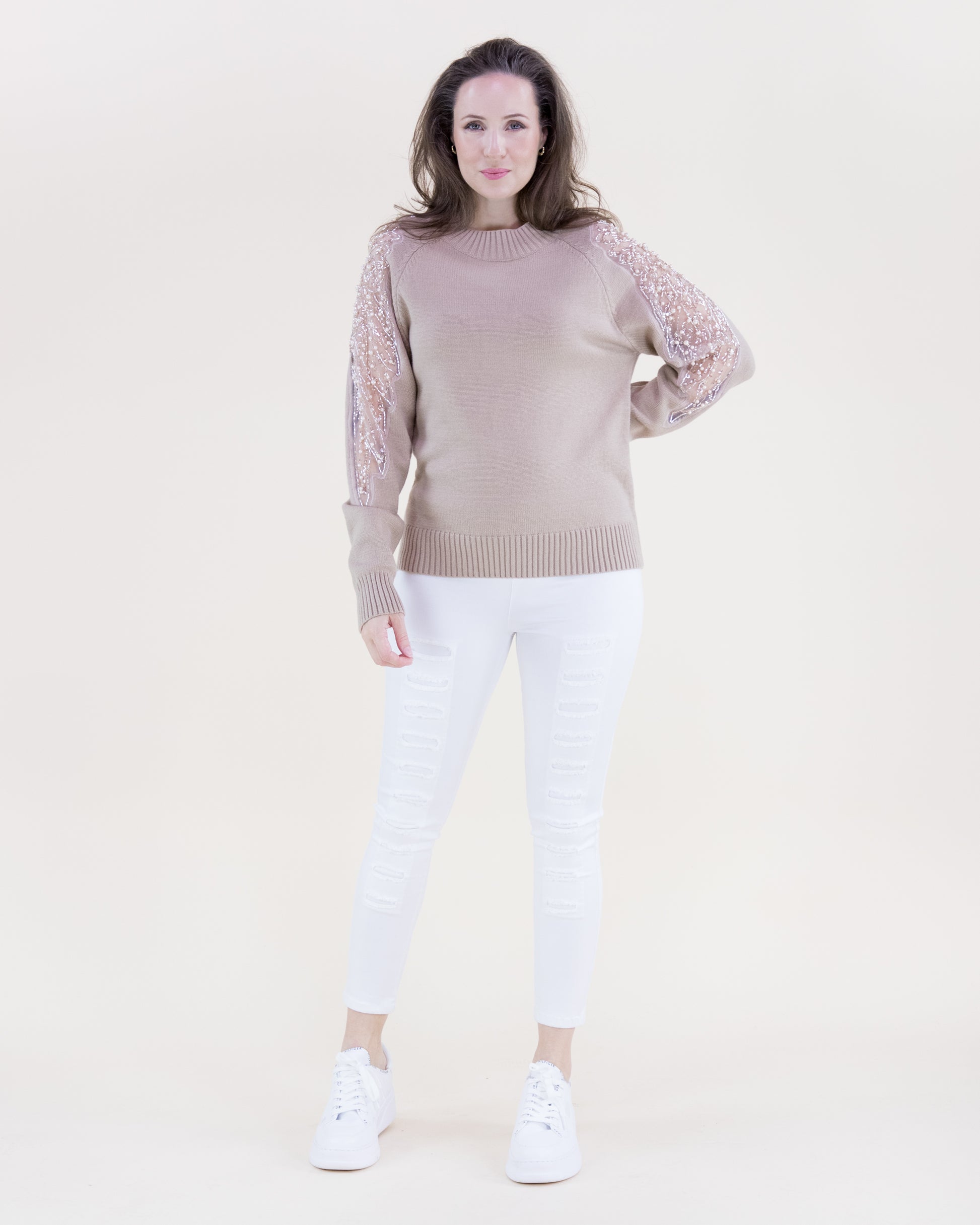 The Beads & Pearls Embellished Sheer Sleeves Sweater captures effortless elegance with a hint of glamour. The knit body keeps you warm and comfortable, while the sheer sleeves adorned with pearls and beads add sophisticated sparkle. Perfect for pairing with tailored pants, skirts, or denim for a chic refined look.