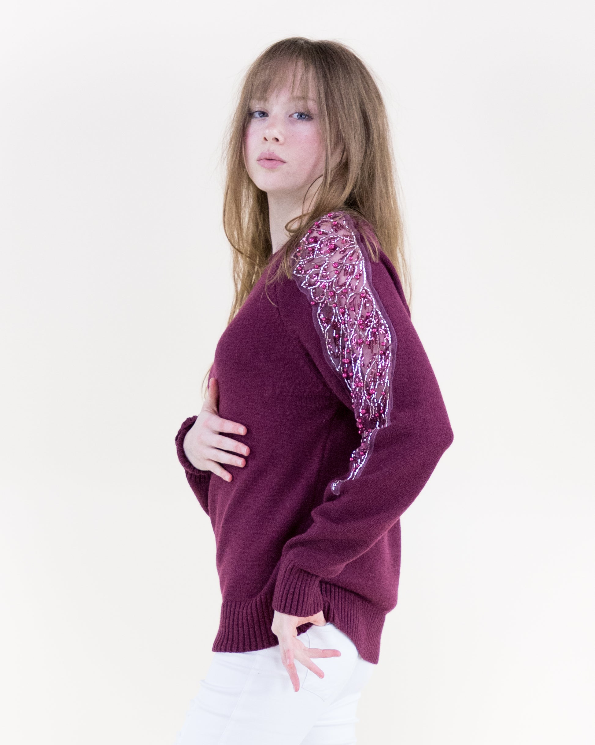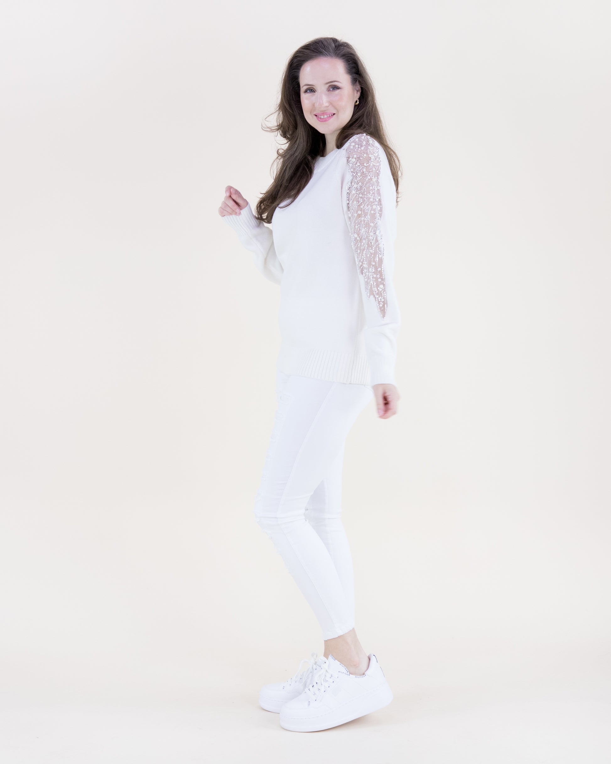 Beads & Pearls Embellished Sheer Sleeves Sweater - S/M, L/XL