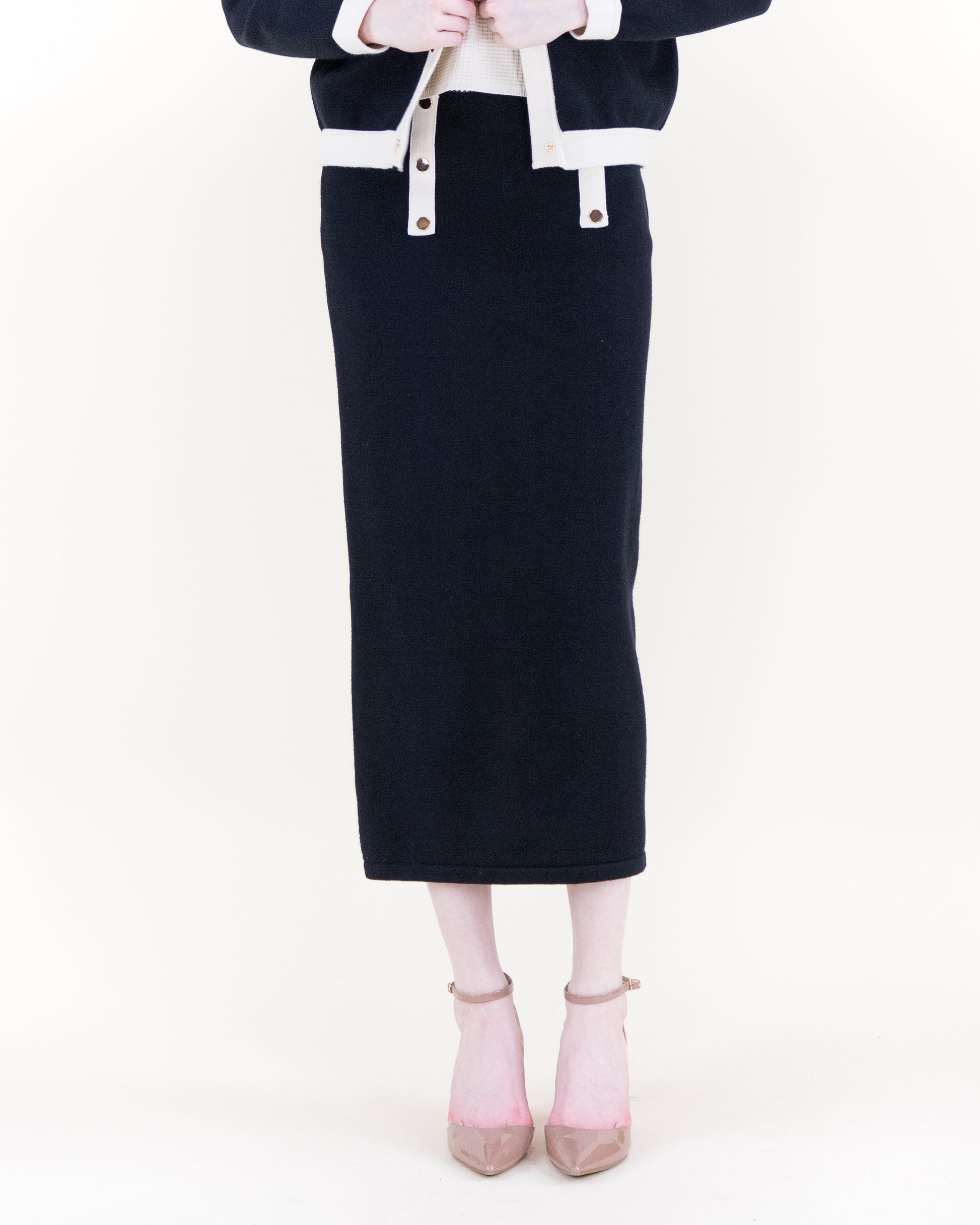 The Color Blocked Knit Set redefines effortless elegance. The structured cardigan with contrast trimming pairs beautifully with the body-hugging midi pencil skirt, creating a refined silhouette that’s timeless and versatile.
